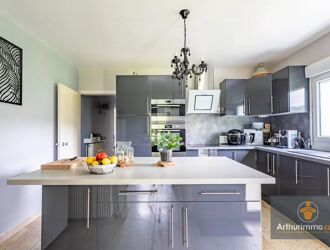 Dès l’entrée, le ton est donné : un hall traversant de 26 m² s’ouvre sur un salon double exposition de près de 29 m² avec cheminée en marbre et une salle à manger lumineuse aux fenêtres cintrées. La cuisine dînatoire haut de gamme, équipée d’un plan en marbre, invite à la convivialité.